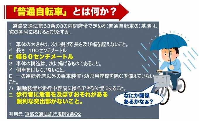 注目ポイントはここ。「普通自転車は鋭利な突出部がなく幅60cm以内でなくてはならない」。これが傘スタンドに大いに関わってくるのです。