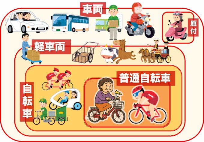 車両の区分には、図の通り、軽車両というものがあり、その軽車両の中に「自転車」と「普通自転車」が存在します。その普通自転車の区分には、ママチャリから、ロードバイク、MTB、折りたたみ自転車など、さまざまな「普通の自転車」が含まれるのですが、その普通自転車のレギュレーションはこうです。