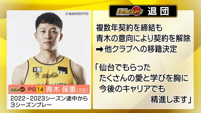 プロバスケットボール仙台89ERSで、今シーズンを含め2シーズン、キャプテンを務めた青木保憲選手が退団することになりました。