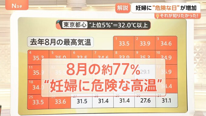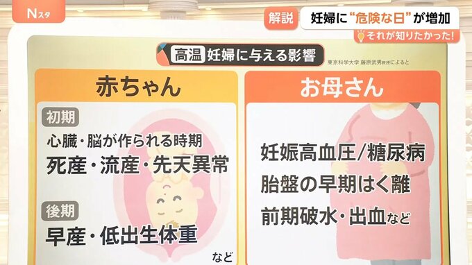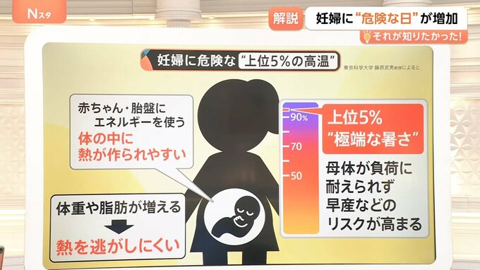 今回の研究結果で特に警戒しなければいけないとされたのが“上位5%の高温”です。そもそも妊婦は赤ちゃんを体の中で育てたり胎盤を作ったりすることにエネルギーを使うので、体の中に熱が作られやすい状態になっています。また、赤ちゃんを守るために脂肪が増えたりするので、熱を逃がしにくい状態にもなっています。体に熱を溜めやすいような状態になっているうえ、夏には外からの暑さも加わってきます。