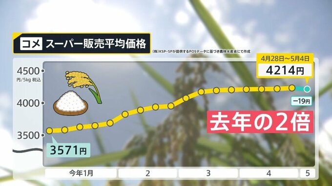 備蓄米が流通し始めたこともあり、スーパーでの平均販売価格は18週ぶりに下落。ただ、2024年の2倍という高値が続いています。