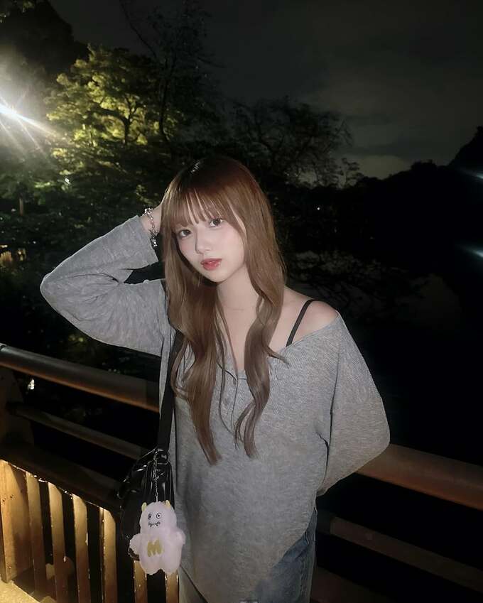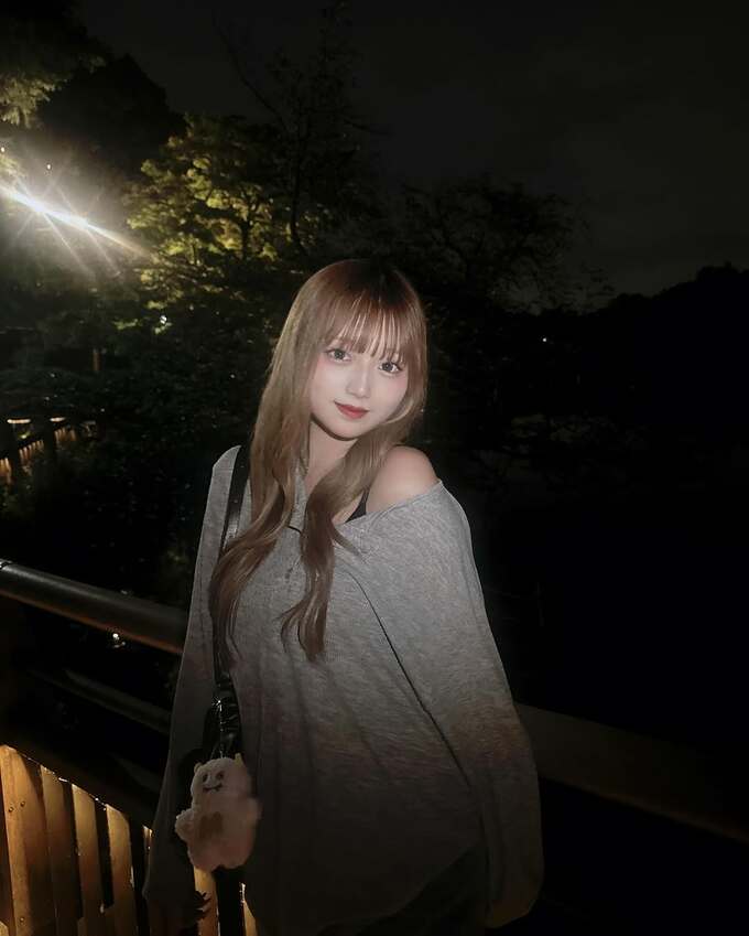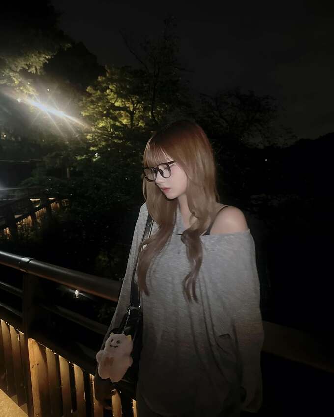 投稿された写真では、希空さんが静寂な夜の雰囲気の中でグレーのオフショルダートップスを着用し、普段とは異なるメガネ姿でカメラを見つめています。