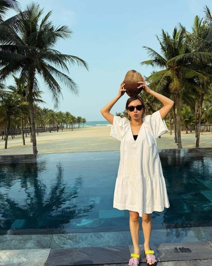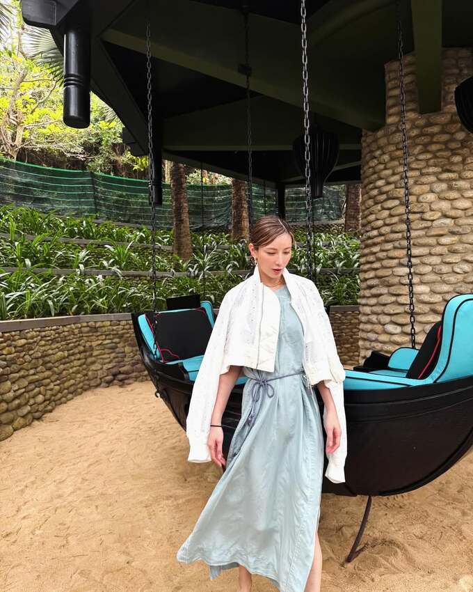 俳優の加藤あいさんが自身のインスタグラムを更新し、ベトナム旅行の新たな写真を公開しました。涼しげな水色のワンピースにカーディガンを羽織ったリゾートスタイルや、ココナッツを頭上に掲げたおちゃめな姿などが印象的です。