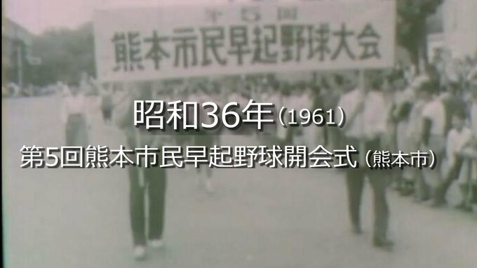 昭和36年(1961)6月、第5回熊本市民早起野球大会開会式の映像です。熊本市では、野球を愛する市民の親睦と親善の輪を広げ、スポーツを通して健康増進を図ることを目的に、昭和32年から毎年早起き野球大会を開催…