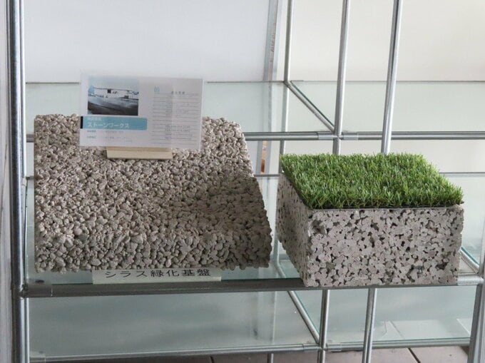 工業技術センターでは、シラスを使った釉薬、煉瓦、吸音材、ガラス繊維など、さまざまな活用法を模索。30年以上研究に携わる主任研究員の袖山研一さんも、シラスを砂の代わりに用いて軽量化と大型化を実現したシラス瓦を開発したほか、軽石を用いて透水性と保水性を活かした、畜舎の床や屋外の緑化などに使えるシラスブロックも製作した。