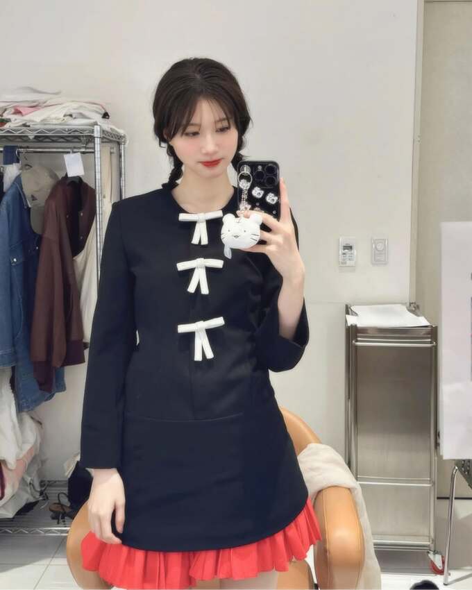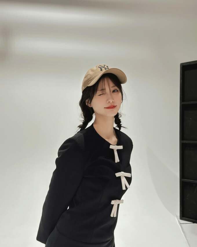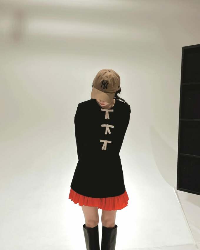 そして衣装は、白のリボンが胸元から3つ着けられた黒のミニのワンピースドレスと、その下からスカーレットピンクのフレアスカートをチラ見せして、シックとキュートを掛け合わせ。さらに、カーキ色のヤンキースキャップをハズしで入れています。