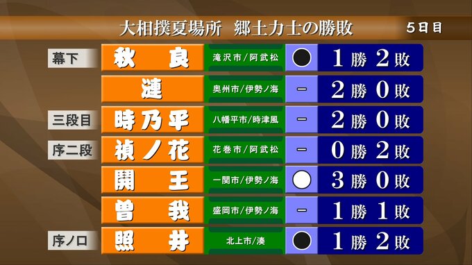 大相撲夏場所5日目、郷土力士の取組の結果です。