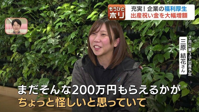 社員の三原結花さんは、7月に3人目の子どもを出産予定で、この200万円が支給される第1号となります。