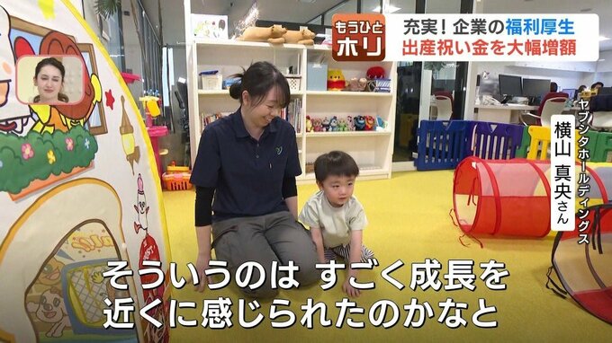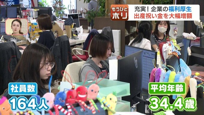 社員は全体で164人。平均年齢は34歳で、若い世代が多いことから、去年、福利厚生の「出産祝い金」を大幅に増額しました。