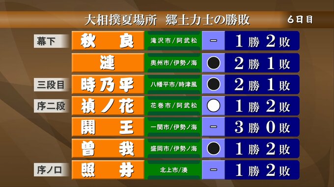 続いては大相撲夏場所6日目、郷土力士の取り組みの結果です。