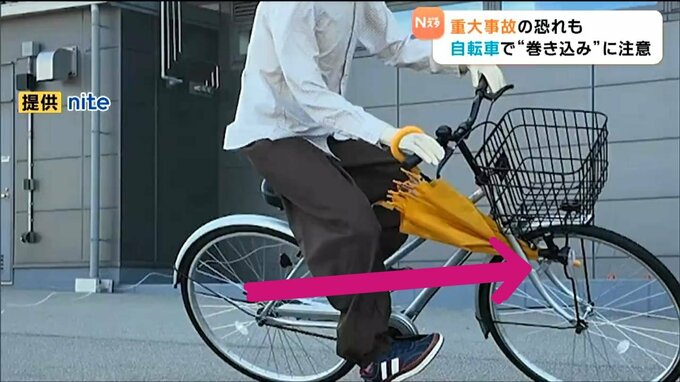 通勤や通学などで多くの人が利用する自転車ですが、ある運転の仕方で重大な事故につながる危険性があるとして、製品事故を分析する団体が注意を呼びかけています。手首に傘をぶら下げて自転車を運転していると…傘…