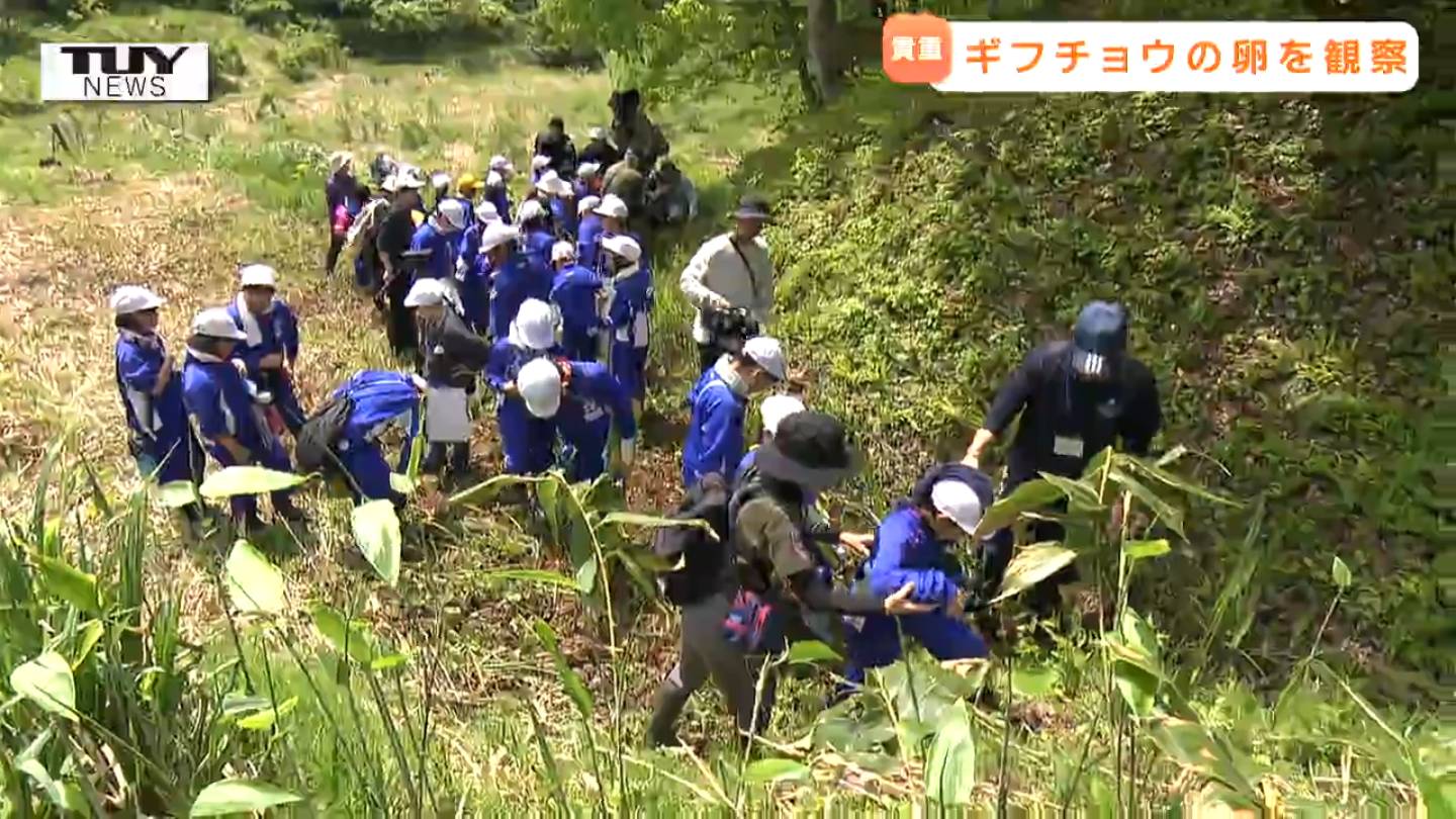 「生きた化石」ともいわれるギフチョウの生息地として知られる大石田町できょう、子どもたちが貴重な卵の観察を行いました。