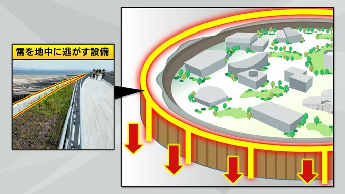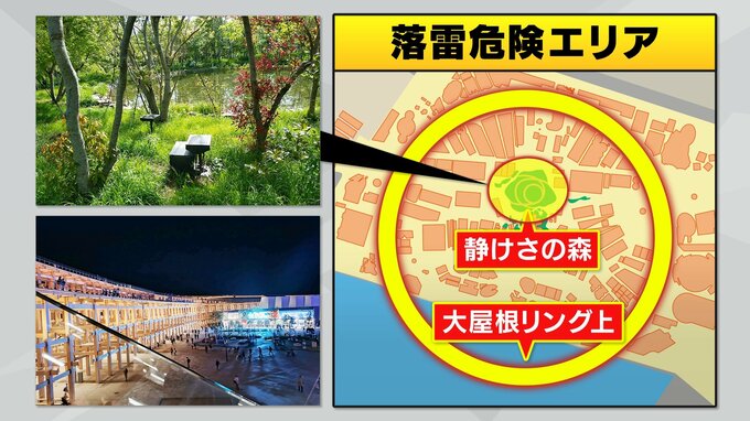 大屋根リングの外縁部には、「水平導体」と呼ばれるアルミ製の板がぐるりと取り囲まれていて、雷を受け止める構造になっています。「水平導体」に雷が落ちると、引き下げ導線を通って、落ちた雷を地中に安全に逃がすことができます。博覧会協会によりますと、この避雷設備によって、大屋根リング下は雷の直撃の可能性が低い「保護範囲」になっているとのことです。