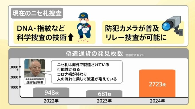 偽造通貨対策研究所の遠藤智彦所長によると、「ニセ札は海外で製造されている可能性がある。コロナ禍が終わり、人の流れに乗じて流通が増えているのではないか」と言います。