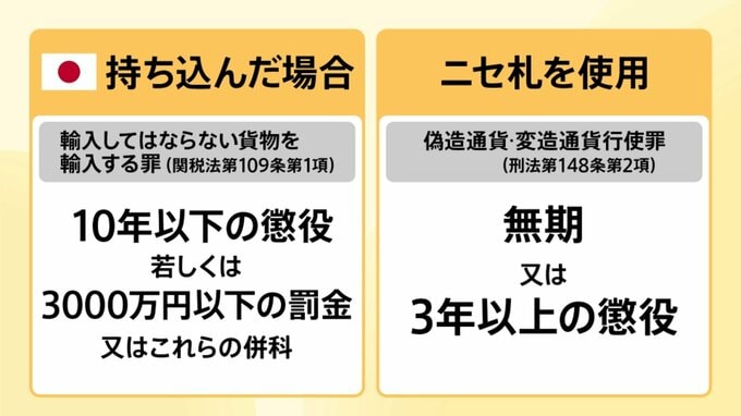 日本国内にニセ札を持ち込んでしまった場合、「輸入してはならない貨物を輸入する罪(関税法第109条第1項)」に問われ、10年以下の懲役もしくは3000万円以下の罰金またはこの両方が科せられます。