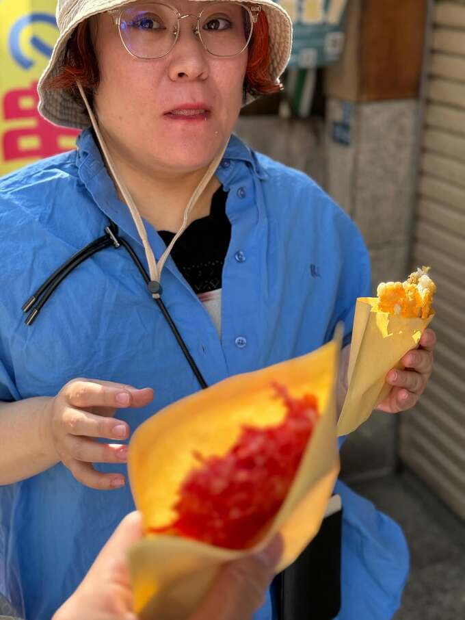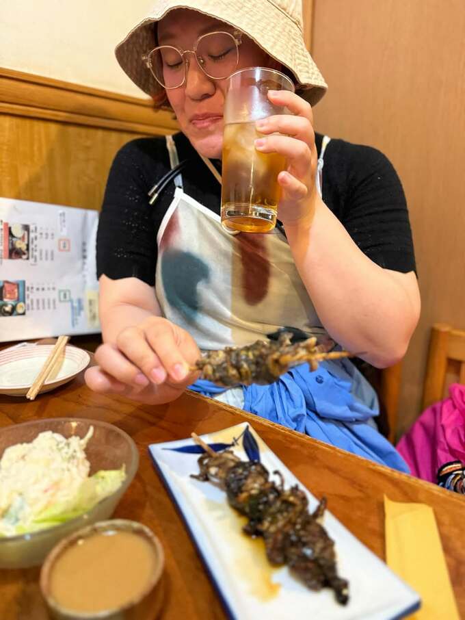 お店でグラスと串焼きを手に悦に入る写真は「②谷中銀座の鰻の肝串は天下一品」と、グルメ&飲んべえには共感大。神ちゃんと一緒にベビーカーを押しながら振り返る写真は「③危ないものを運んでる風のワタシ」で、帽子の下の目つきが鋭い。
