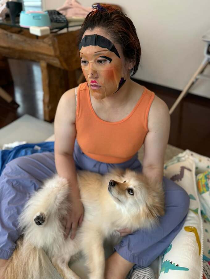 バービーさんが投稿したのは9枚の写真。1枚目から飛ばしていて、メイク用のマスクらしきものを顔に貼って呆然、の写真には「①イカゲームのシートマスクを神ちゃんが凝視」膝の上でバービーさんを愛犬・神ちゃんが見上げている様子がキュート。