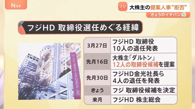 経営陣を刷新して「変革を進める」というフジテレビと親会社ですが、大株主が提案する新たな取締役候補12人全員を外す方針を固めたことがわかりました。