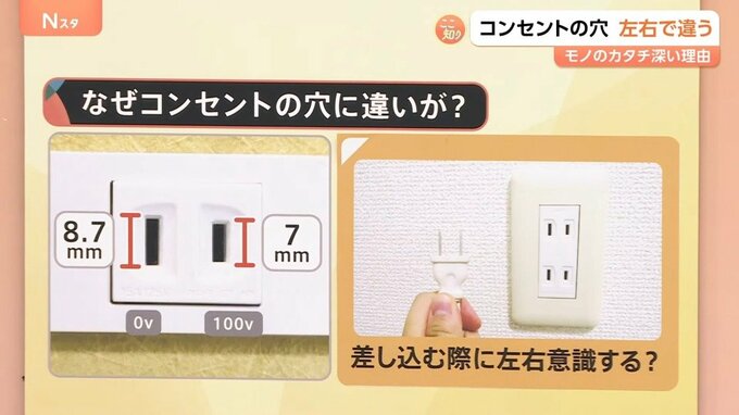 見てもあまりわかりませんが、向かって右側(100V)が7ミリで、向かって左側(0V)が8.7ミリと、約2ミリの違いがあります。“三苫の1ミリ”ならぬ、コンセントの2ミリです。いったい、どのような理由があるのでしょうか?