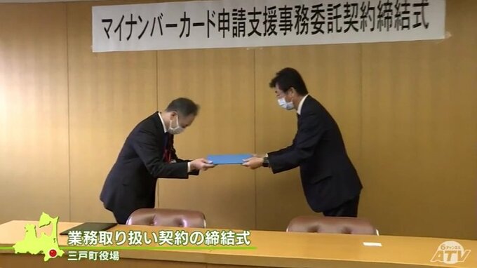 青森県三戸町の三戸郵便局で、1日からマイナンバーカードの申請を支援するサービスが青森県内で初めて始まります。これを前に、町と日本郵便が業務取り扱いの契約を結びました。