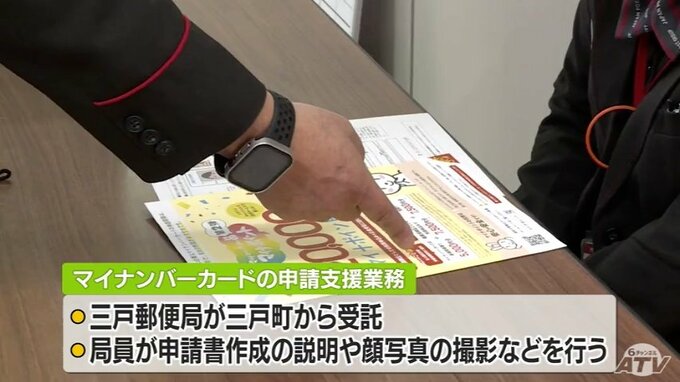 青森県内で初めてとなるサービスは、三戸郵便局が町から業務を請け負い、局員が申請書作成の説明や顔写真の撮影などを行います。そして郵便局が町に申請書を提出し、申込者は役場でカードを受け取る仕組みです。