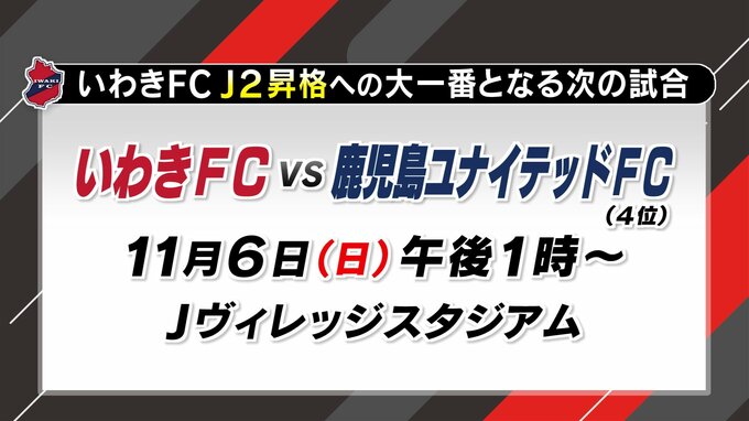 昇格への大一番となるいわきFC。次の試合は11月6日、Jヴィレッジスタジアムで、4位の鹿児島ユナイテッドFCと対戦します。