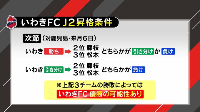 次の試合でいわきFCが昇格を決める条件は、いわきが勝利し、2位藤枝、3位松本のどちらかが引き分けか負け、または、いわきが引き分けでどちらかが負け、になります。