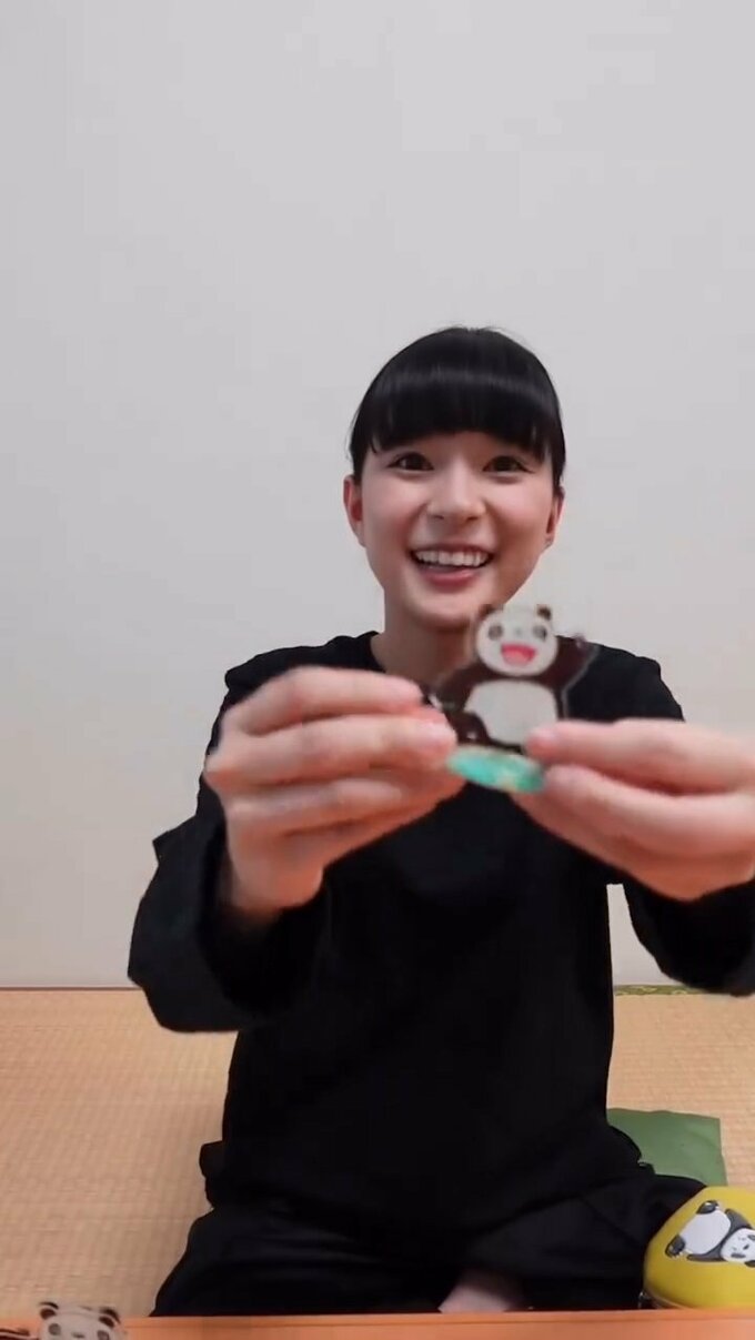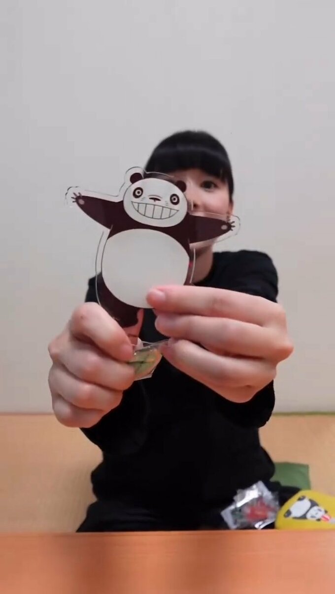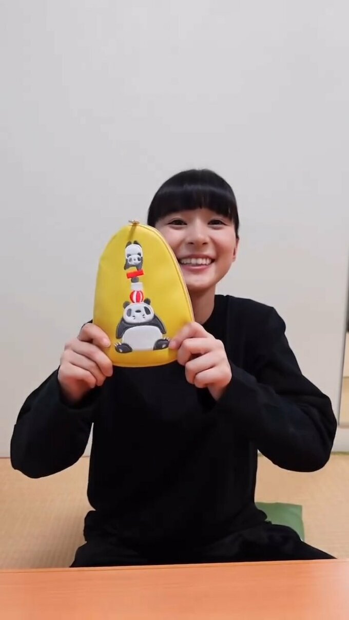 芳根さんは、動画の冒頭で、縦長のオムレツのようなポーチを掲げました。そこには、座り込む大きなパンダの頭上に小さなパンダが逆立ちしている可愛い図柄が。