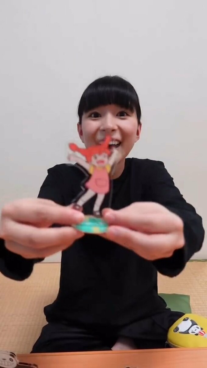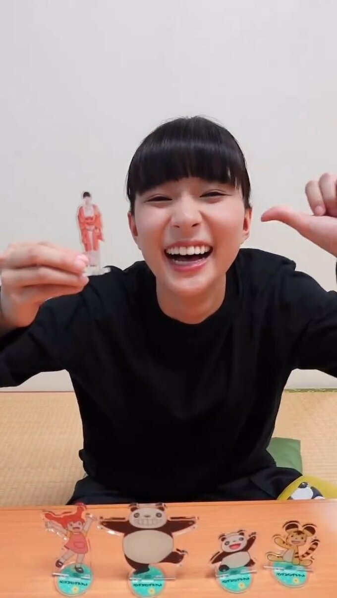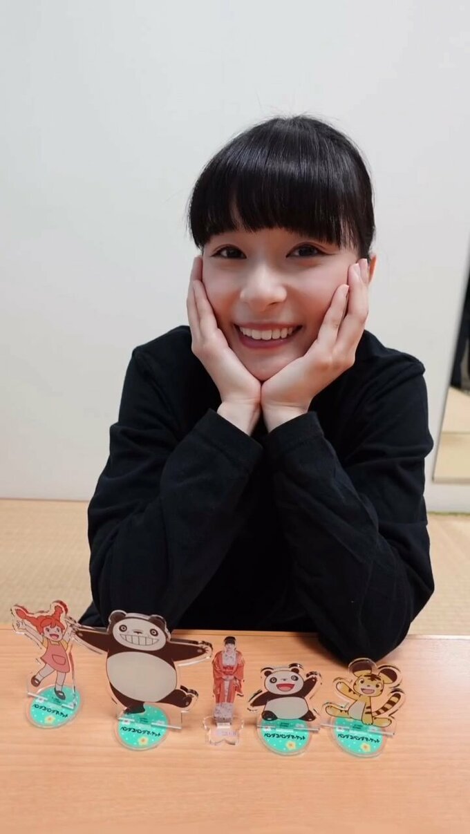 そんな “アクスタ” を組み立てては並べる芳根さんが次に取り出したのは、なんと自身のアクリルスタンド。嬉しそうに自分を左の親指で指し示して、卓上に並べた「パンダコパンダ」たちの間に自身のアクスタを挟み込みました。