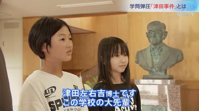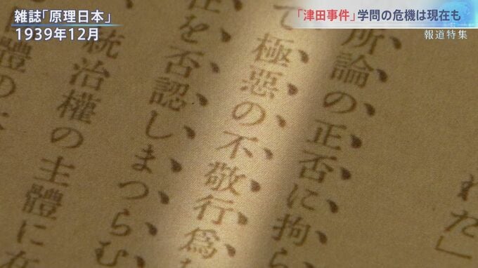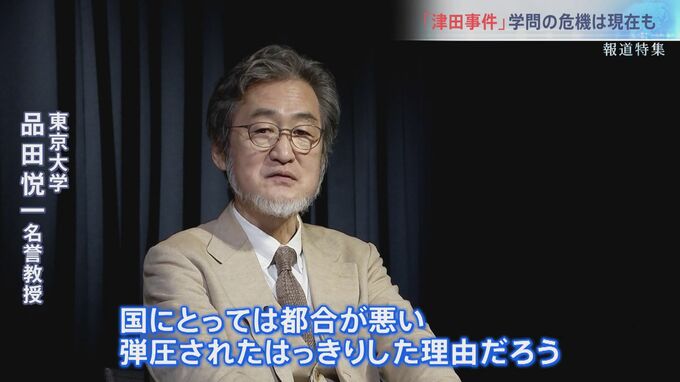 「(津田事件は)西暦でいうと1940年、神武天皇即位2600年目ということで、国を挙げて大きなお祭りをする、国威を発揚するときに、津田は神武天皇はいなかったと本にして出しているから、国にとっては都合が悪い。弾圧されたはっきりした理由だろう。邪魔なものは排除していいということがまかり通る時代になって、悪い前例が残ったということ」