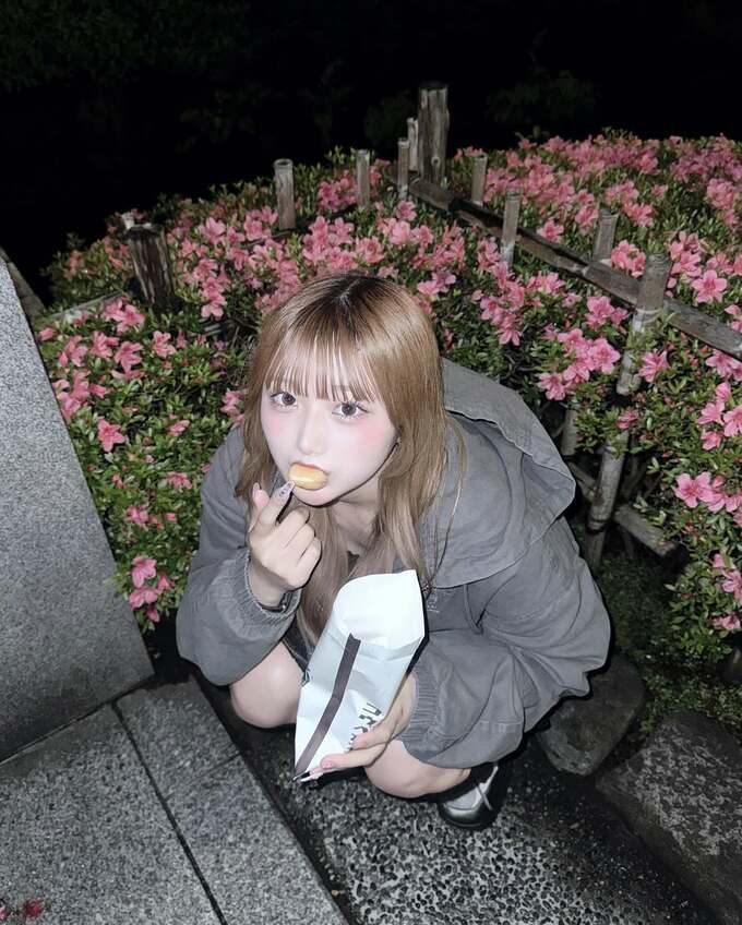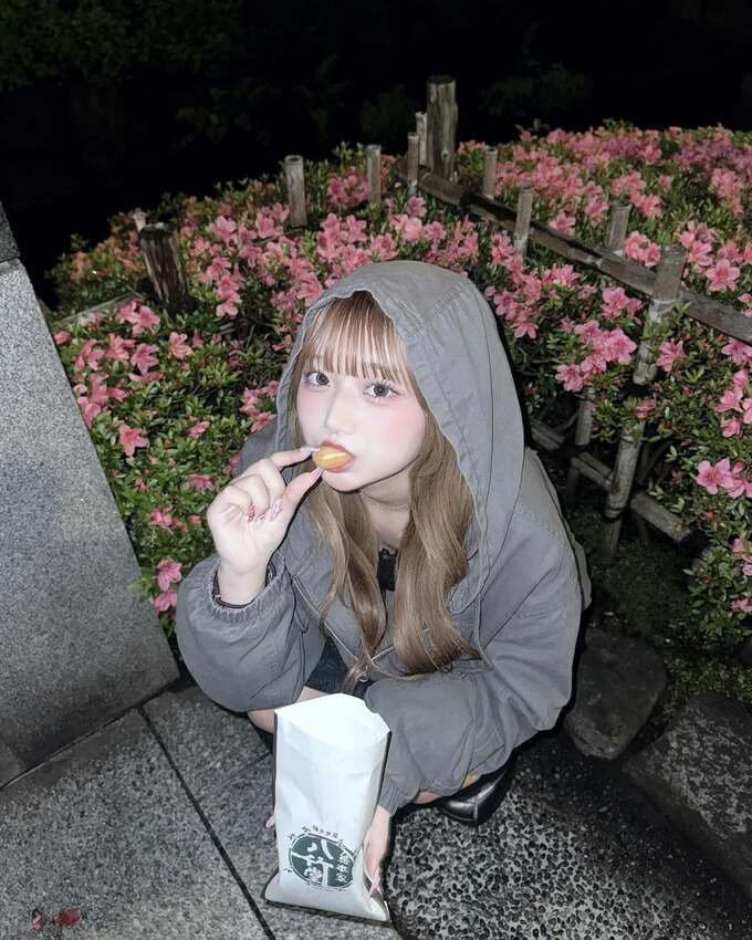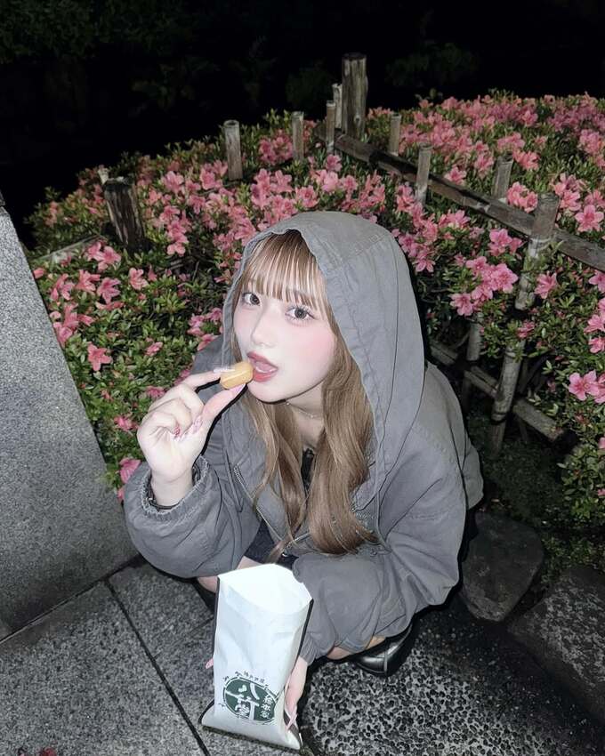 投稿された写真では、グレーのフード付きパーカーを着用しながらピンク色の花をバックにしゃがみ込みベビーカステラを食べる姿がとらえられています。