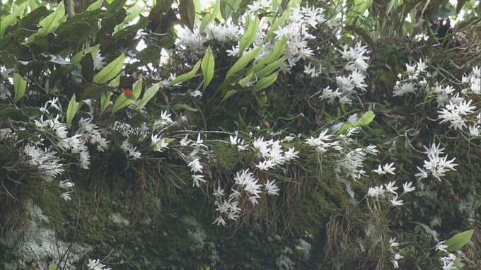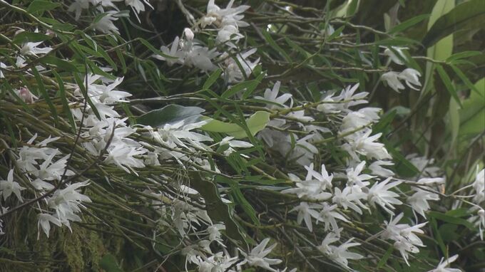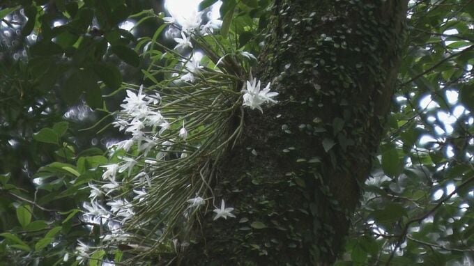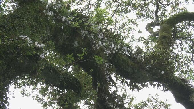 樹齢800年のご神木に自生する可憐な白い花“セッコク”が見頃 乱獲などで数が減少 三重・紀宝町の神内神社