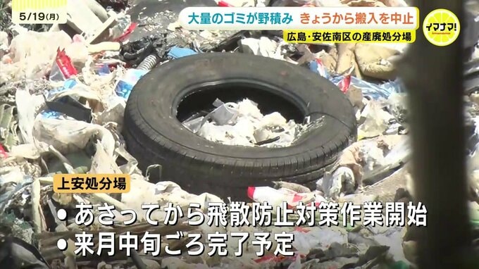 現場では、19日から搬入や埋め立てが中止され、ゴミを覆うための真砂土や高く積み上がったゴミを平して踏み固めるための大型の重機などが搬入されます。実際に土をかぶせる作業は、21日から始まるということです。作業は、6月中旬までかかるとみられていて、広島市が現場を確認して再開を認めるかどうかを判断するということです。