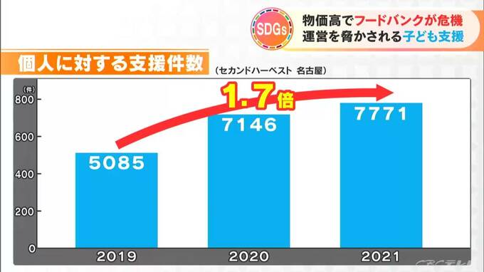 去年、セカンドハーベスト名古屋が支援した個人の数は、2019年に比べるとおよそ1.7倍。コロナ禍で職を失った人や物価上昇で生活苦の人が増えていることが影響しています。