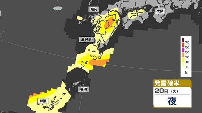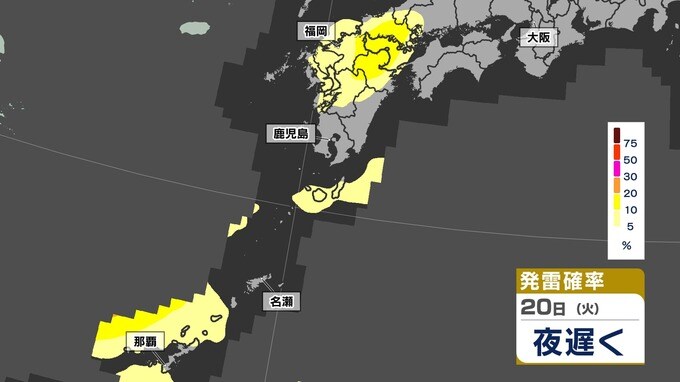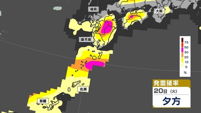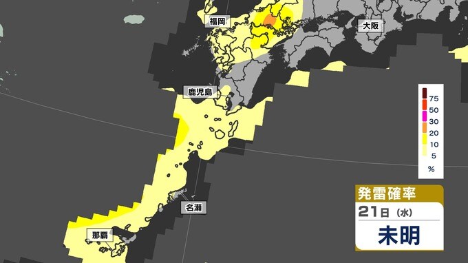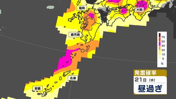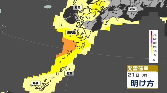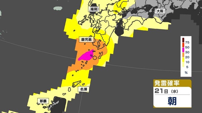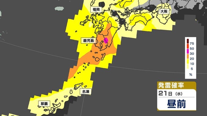 【あす21日(水)大雨のおそれ】梅雨前線北上 鹿児島150ミリ 熊本100ミリ【雨と発雷確率のシミュレーション21日(水)~22日(木)】福岡・佐賀・長崎・大分・熊本・宮崎・鹿児島 南日本放送 2025年5月20日(火) 14:20 国内 天気 【発雷確率】のシミュレーション21日(水)~22日(木) 〈発雷確率〉つまり雷の発生確率は、大気の状態の目安になります。確率が高ければ〈大気の状態が不安定〉で、それだけ〈非常に激しい雨〉や〈激しい雨〉、〈雷〉〈ひょう〉が発生する可能性が高くなります。画像で確認できます。