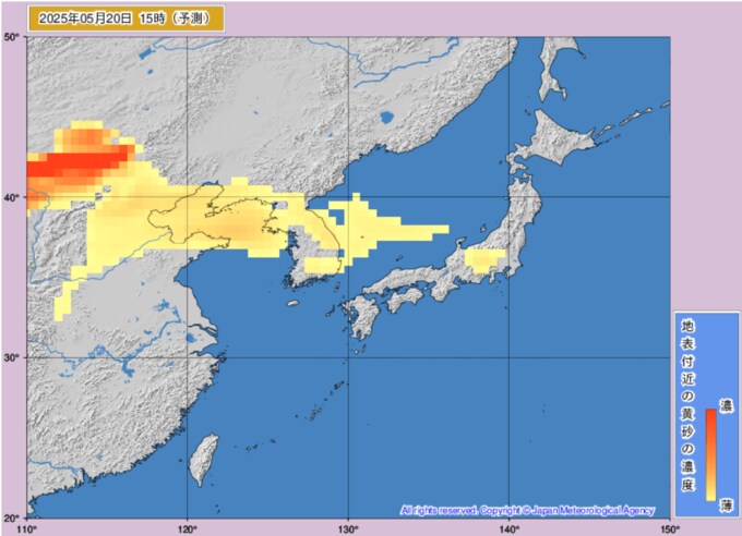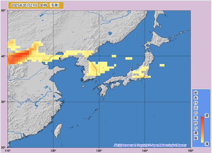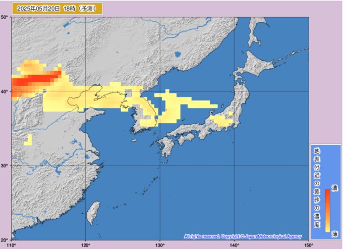 黄砂情報 日本のど真ん中に...20日~21日にかけ関東・東海・北陸地方などに飛来する見込み いつ・どこに飛んでくるか画像シミュレーション 気象庁 テレビユー山形 2025年5月20日(火) 12:38 国内 ■20日