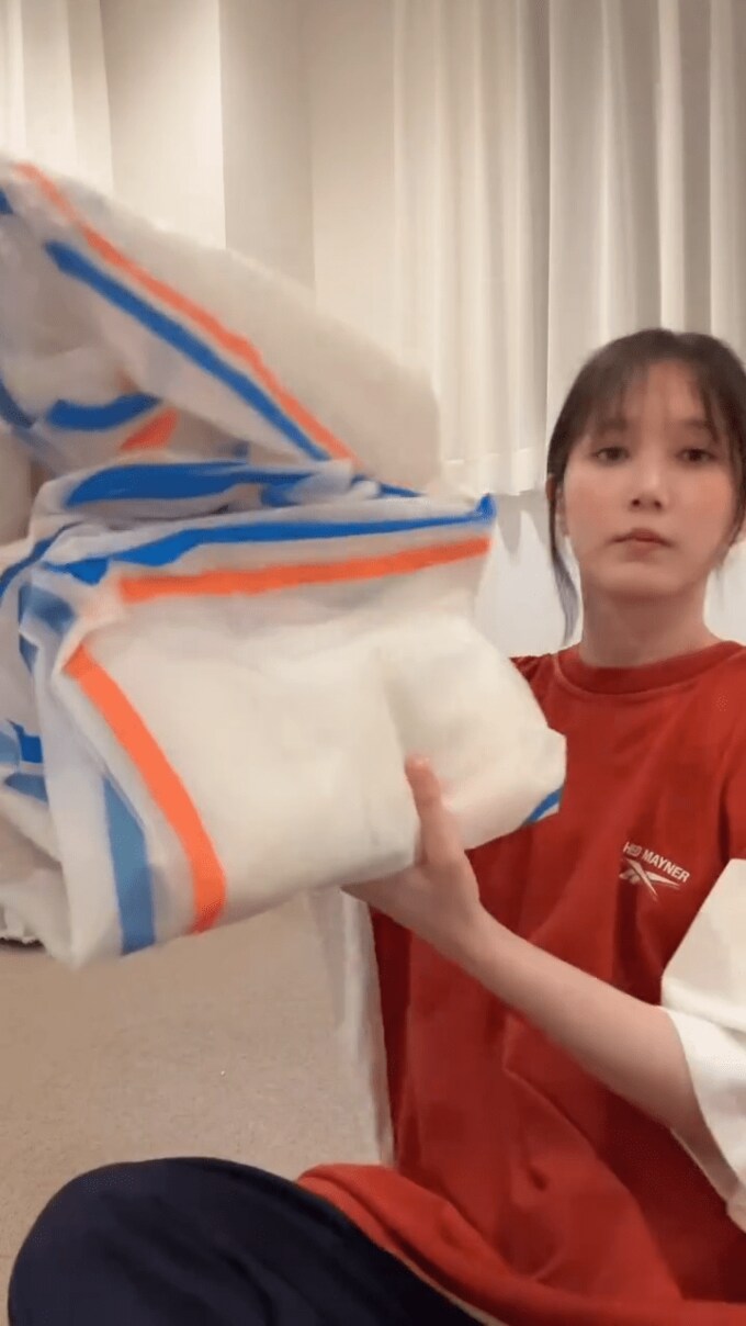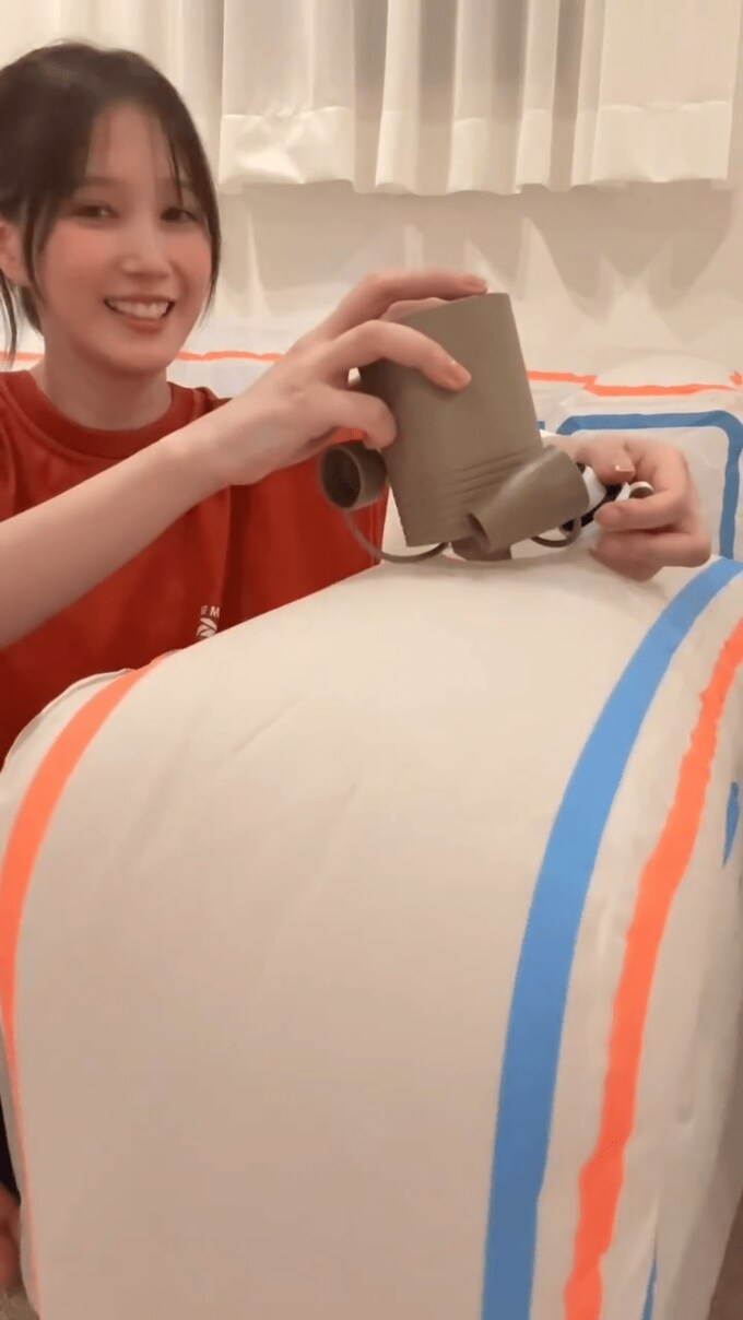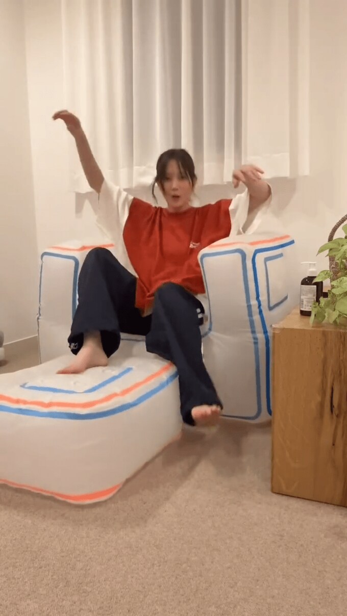 投稿された動画では、本田翼さんが、部品に空気を入れて膨らませて、エアソファーをセッティングする様子が見て取れます。