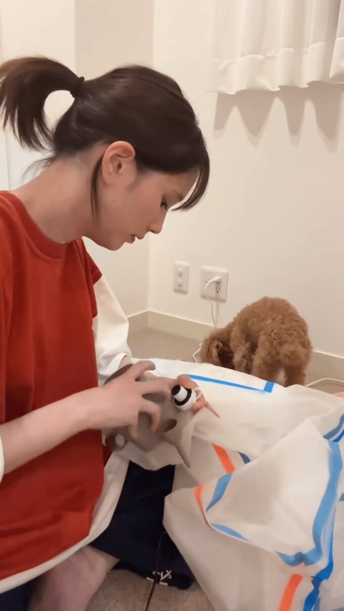 本田翼さんは「座りごごちは特に普通ですがかわいい」と綴ると、笑顔で愛犬と一緒にソファーに座ってご満悦。
