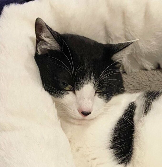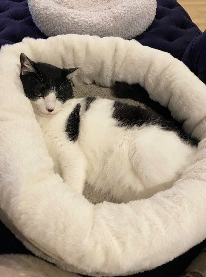 藤さんは、愛猫「オレオ」が猫ベッドで寛いでいる様子を投稿。丸く作ってある猫ベッドに、オレオは半身で横たわり、顔を縁に寄りかからせて、切れ長の目でこちら側に “流し目” をくれています。