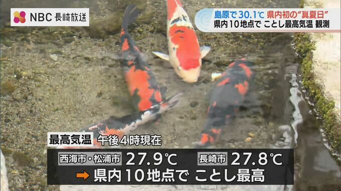 20日は西海市と松浦市で27.9度、長崎市で27.8度など、県内10地点でことし最高の気温となりました。