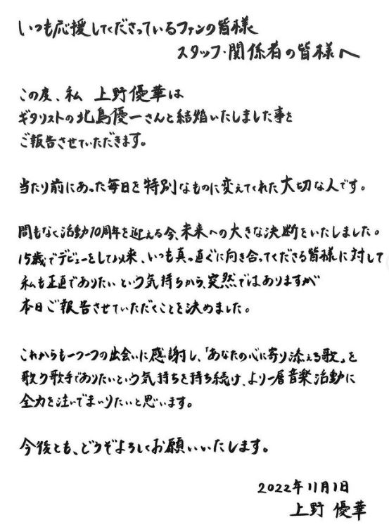ギタリストの北島優一さんと結婚いたしました事をご報告させていただきます。