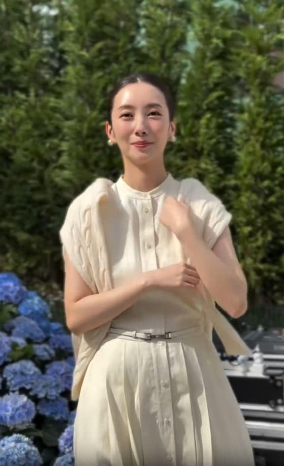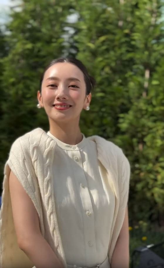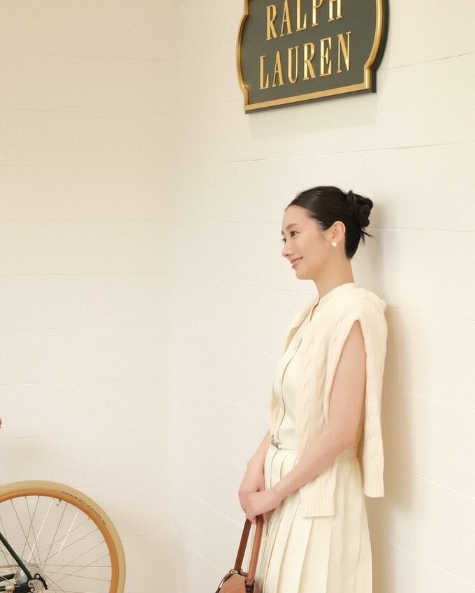 波留さんはクリーム色のワンピースに同系色のカーディガンを肩にかけたコーディネートで参加。