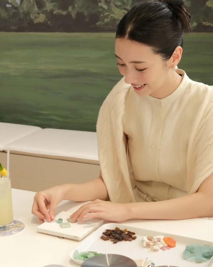 また別のショットでは、室内でシーグラスを手に取る波留さんの姿も。落ち着いた雰囲気の中、シーグラスの色合いを鑑賞している様子が写されています。