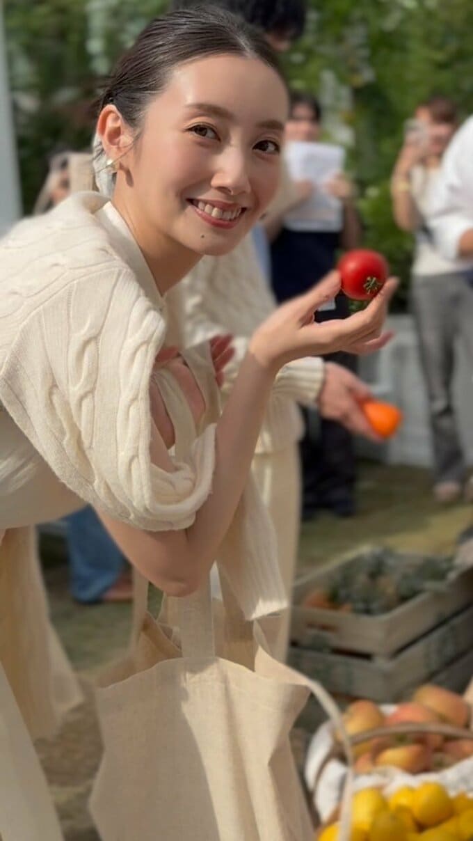 会場では、庭のマーケットを模したコーナーも用意されており、波留さんはトートバッグを持ちながら赤いトマトを手に取り、満面の笑みを浮かべる場面も収められています。