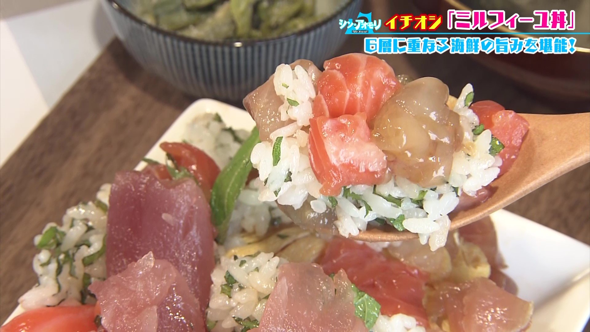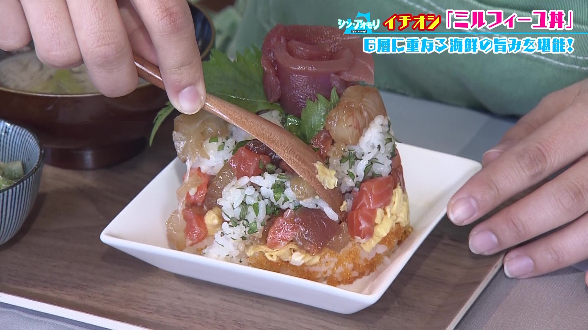 「幸せ~!エビも真鯛もサーモンもマグロ、全部プリプリで身がキュッて締まっている感じ。たくさんの具材たちがおもてなしをしてくれている感じがして、何気ない日常でもこのミルフィーユ丼を食べると特別な1日になりそう」
