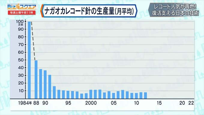 その後、レコードブームがきっかけとなり業績が回復。今年度の生産量は月産平均30万本を超えている。最も重要な針先の大きさは、長さ1ミリ、直径0.25ミリほど。製造工程は①「土台となるチタンの上にダイヤモンドを乗せる」②「高温で熱し、チタンとダイヤモンドを接着する」③「できたものを削り、針先を尖らせる」。針先の研磨や製品の検査など、作業のほとんどが今でも熟練の職人の手によって行われている。
