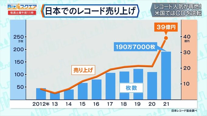 日本でもレコードの売り上げは右肩上がりで、去年は前年比約2倍の190万枚、売り上げも約40億円に達した。東京・渋谷の大手CDショップは2021年、6階のワンフロア全てをアナログレコード専門の売り場にリニューアルした。品揃えは中古レコードを含め7万枚に及ぶ。