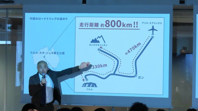 “ケアンズ、シドニー、ブリスベン。オーストラリアにはプライベートでも遊びに行っている”と、「オーストラリア好き」な一面を明かしたあばれる君。訪れた際のロードトリップの道のりをスクリーンに投影すると、旅の良さを熱弁。実際に自身が車で走った直線道路が映し出されると、“夢だったんです、こういう真っ直ぐな道を運転するの。信じられないくらい真っ直ぐ。ラクダが並走してくる”と、興奮気味に紹介しました。