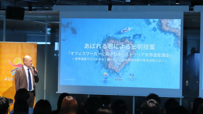 お笑い芸人のあばれる君が、「オフィスワーカーに向けたオーストラリア世界遺産講座」に登壇。オーストラリア世界遺産キャンペーンアンバサダーとして、「有給休暇の効果的な使い方」を指南する出前授業を行いました。