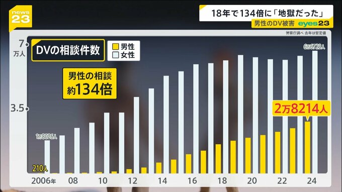 今、Aさんのように、配偶者や交際相手からのDV被害を訴える男性は年々増加。最新の調査では、およそ2万8000件。18年前の、実に約134倍と急増しているのです。